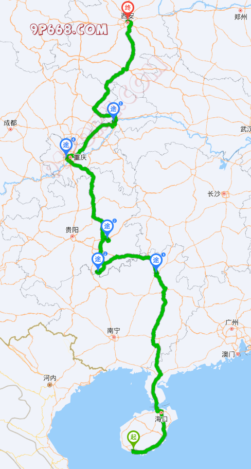 大概途径:三亚、南宁、桂林、重庆、西安